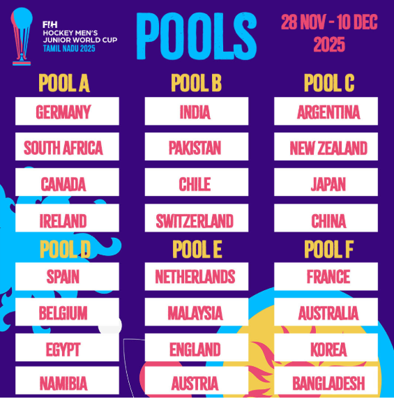 Lausana, Suiza – Con motivo de la ceremonia de sorteo celebrada hoy en Lausana, Suiza, se han determinado los seis grupos de la próxima Copa Mundial Juvenil Masculina de Hockey FIH Tamil Nadu, India 2025 ampliada, que contará con 24 equipos por primera vez, de la siguiente manera: