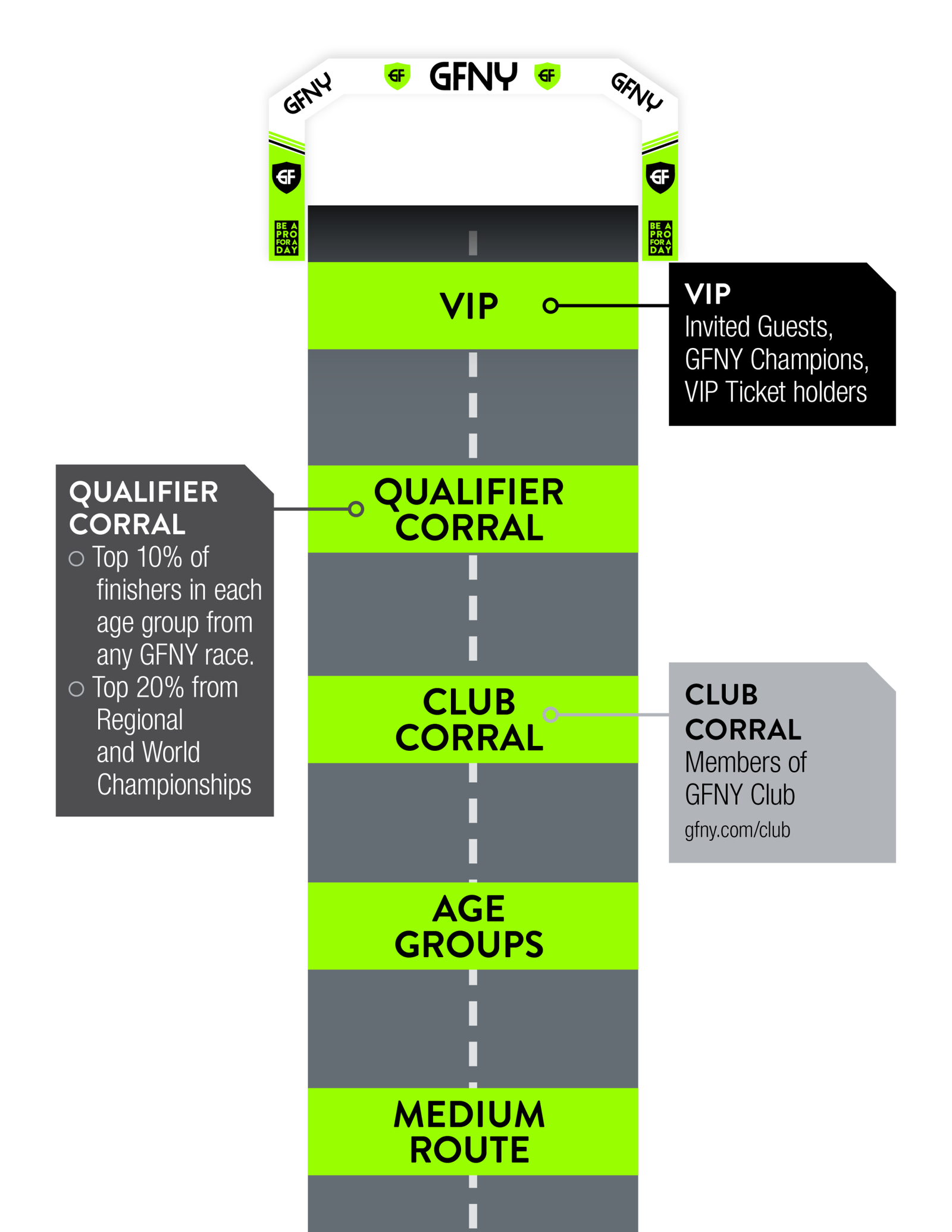 Celebrar una carrera profesional y una carrera de participación masiva al mismo tiempo en el mismo recorrido es un formato de evento que nunca antes se había celebrado en el ciclismo, aunque es algo que se hace habitualmente en el atletismo y el triatlón. GFNY está dando un paso revolucionario para reunir las carreras profesionales y las de participación masiva con el fin de aumentar ambos campos de carreras y aprovechar las operaciones, la logística y la exposición existentes.